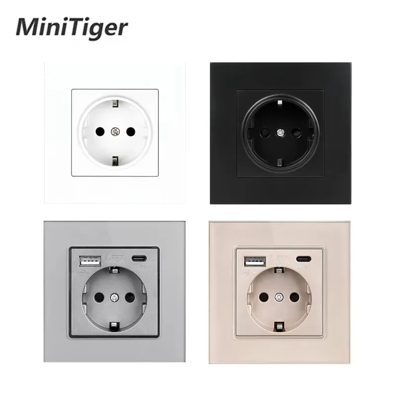 Minitiger USB Power Socket, Glass Panel, Type-C Port, AC 110V-250V 16A Wall Embedded, USB A+C EU Standard Outlet