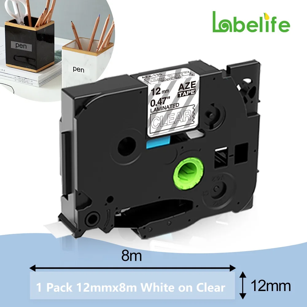 1pcs 135 White on Clear Label Tape 12mmx8m TZe-135 Compatible for Brother P-touch H110 D210 D600 PTP710BT E1000PRO Label Printer