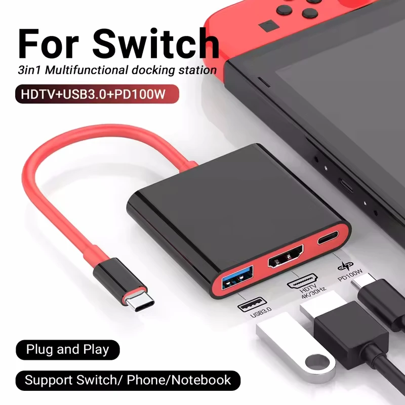 3 IN 1 4k/30hz/60hz Portable for Switch Dock Station TYPE-C Hub with HDMI Adapter Support TV Mode 100W Charge and USB 3.0 Ports