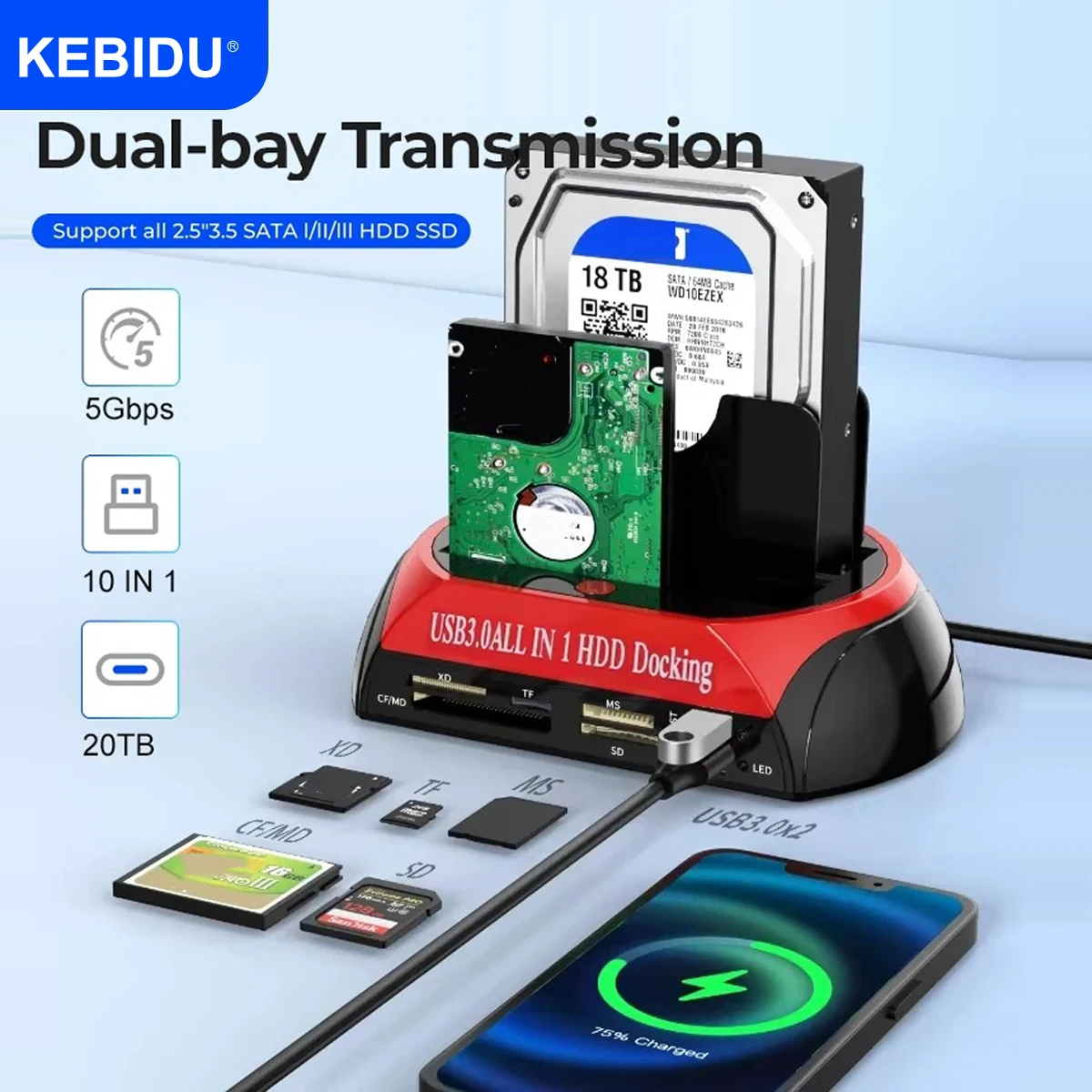 10 IN 1 Dual-bay Hard Drive Station USB3.0 5Gbps HDD Docking Station with 12V 3A Power Adapter for 2.5/3.5 Inch HDD/SSD TF Card  Read more