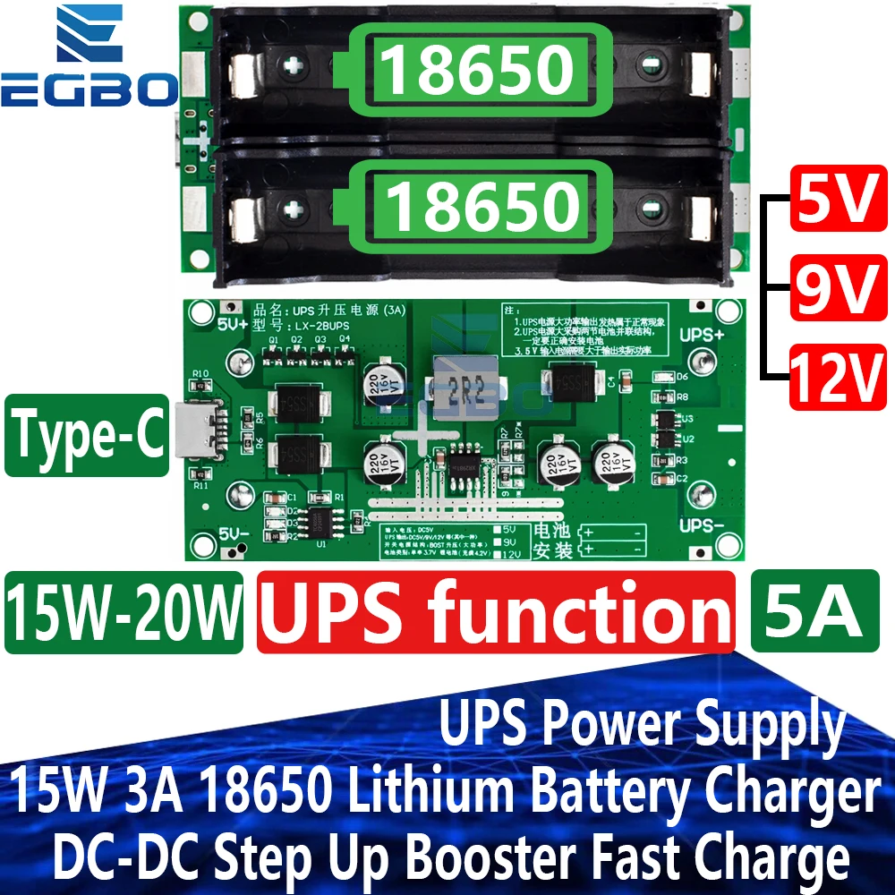 Type-C 15W 3A 18650 Lithium Battery Charger Module DC-DC Step Up Booster Fast Charge UPS Power Supply / Converter 5V 9V 12V