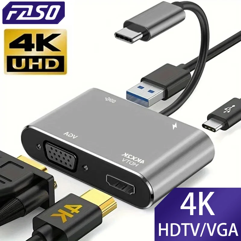 FASO USB HUB 4-in-1 Type C Adapter Hub To HDTV VGA USB 3.0 Digital AV Multiport Adapter With TYPE-C PD Charging Port Compatible