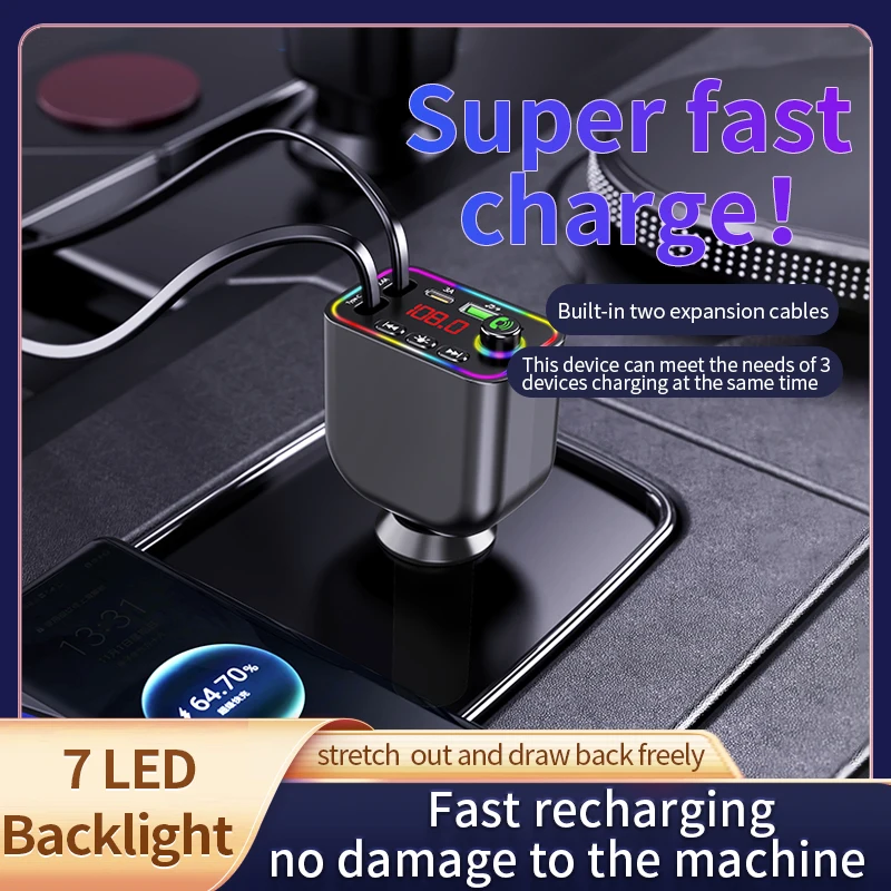 7-Colors Backlit Car MP3 Music Player Wireless Hands Free Call Car Fast Charger Retractable Cables For iPhone Samsung Huawei