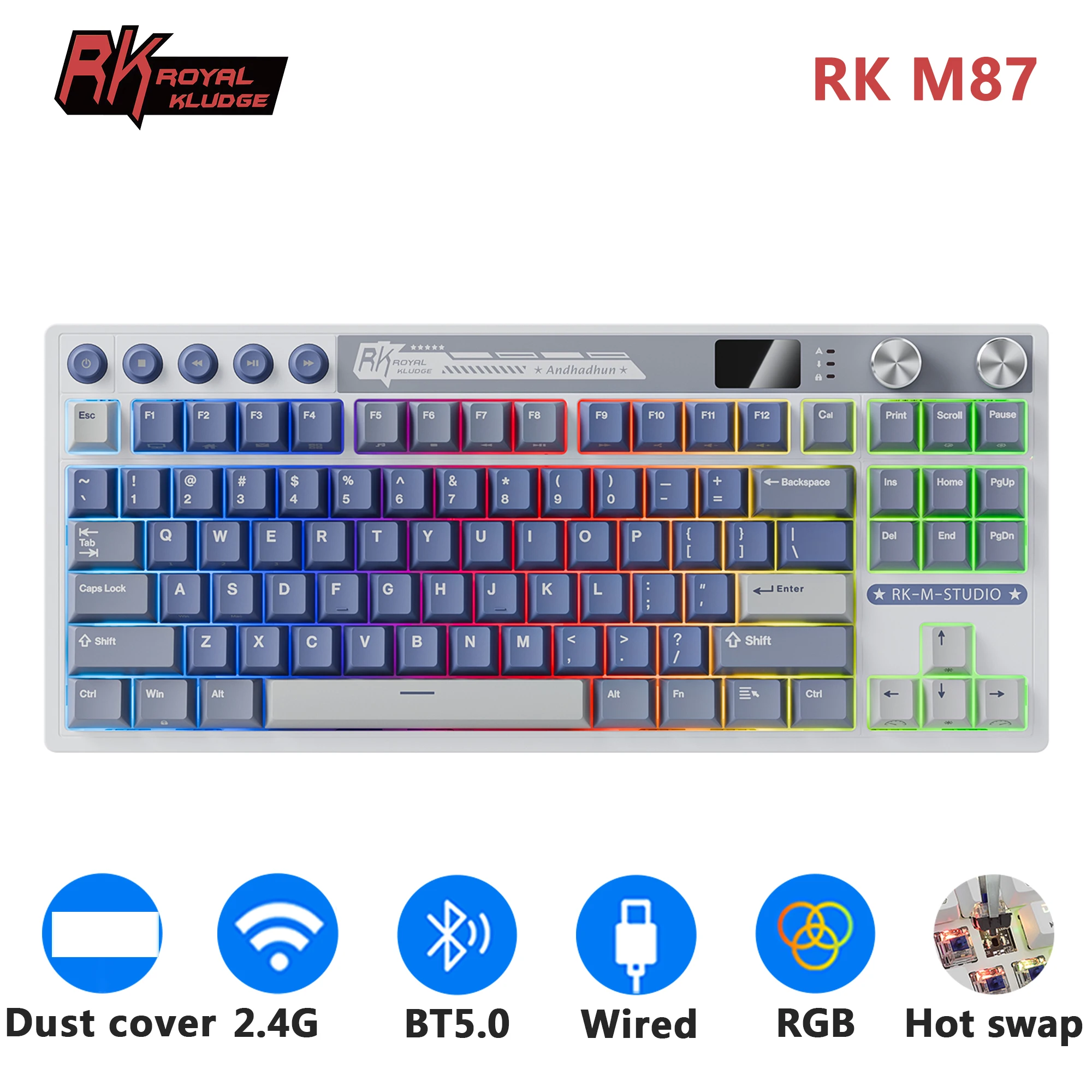M87 RK ROYAL KLUDGE Mechanical Keyboard Wireless/Bluetooth/2.4G/USB-C Hot-Swappable Gasket Gamer Keyboard with TFT Color Screen