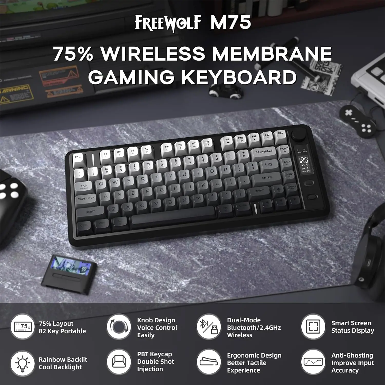 ATTACK SHARK M75 Wireless Membrane Gaming Keyboard with Knob&OLED Display Bluetooth/2.4Ghz Rainbow Backlit Gradient PBT Keycaps