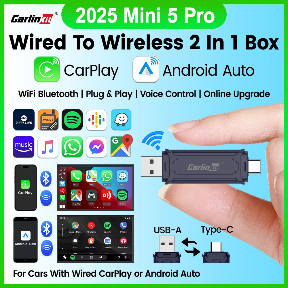 Mini 5 Pro CarlinKit 5.0 2 In 1 Wireless Adapter Wireless Android Auto CarPlay For OEM Car 5.8Ghz WiFi Bluetooth Auto Connection