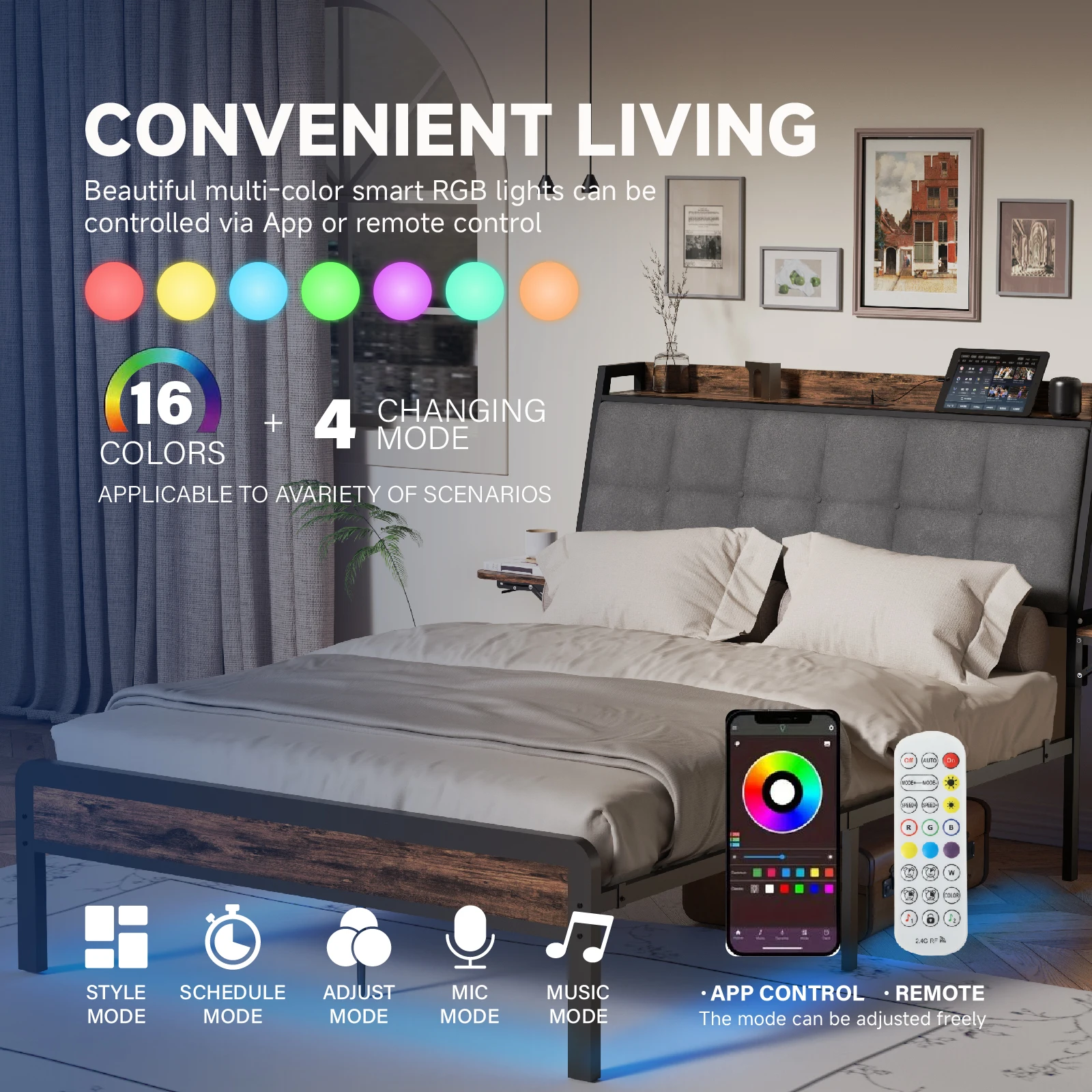 Queen Size Bed Frame with Charging Station and LED Lights, Platform Bed with Metal Slats, Grey Upholstered Headboard