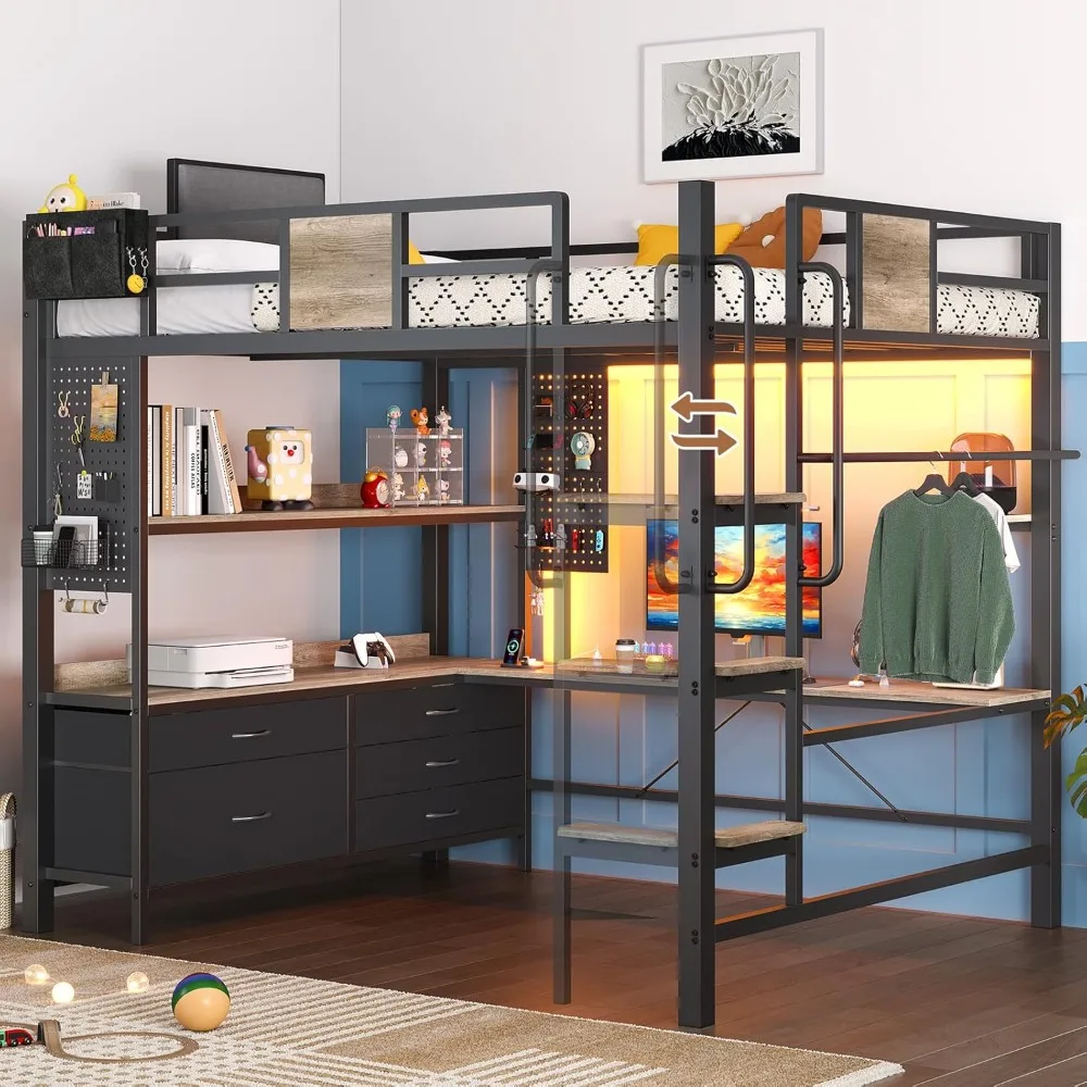 Full Loft Bed with L-Shaped Desk and 7 Storage Drawers, Metal Full Size Loft Bed for Teen with LED Lights and Charging  Read more