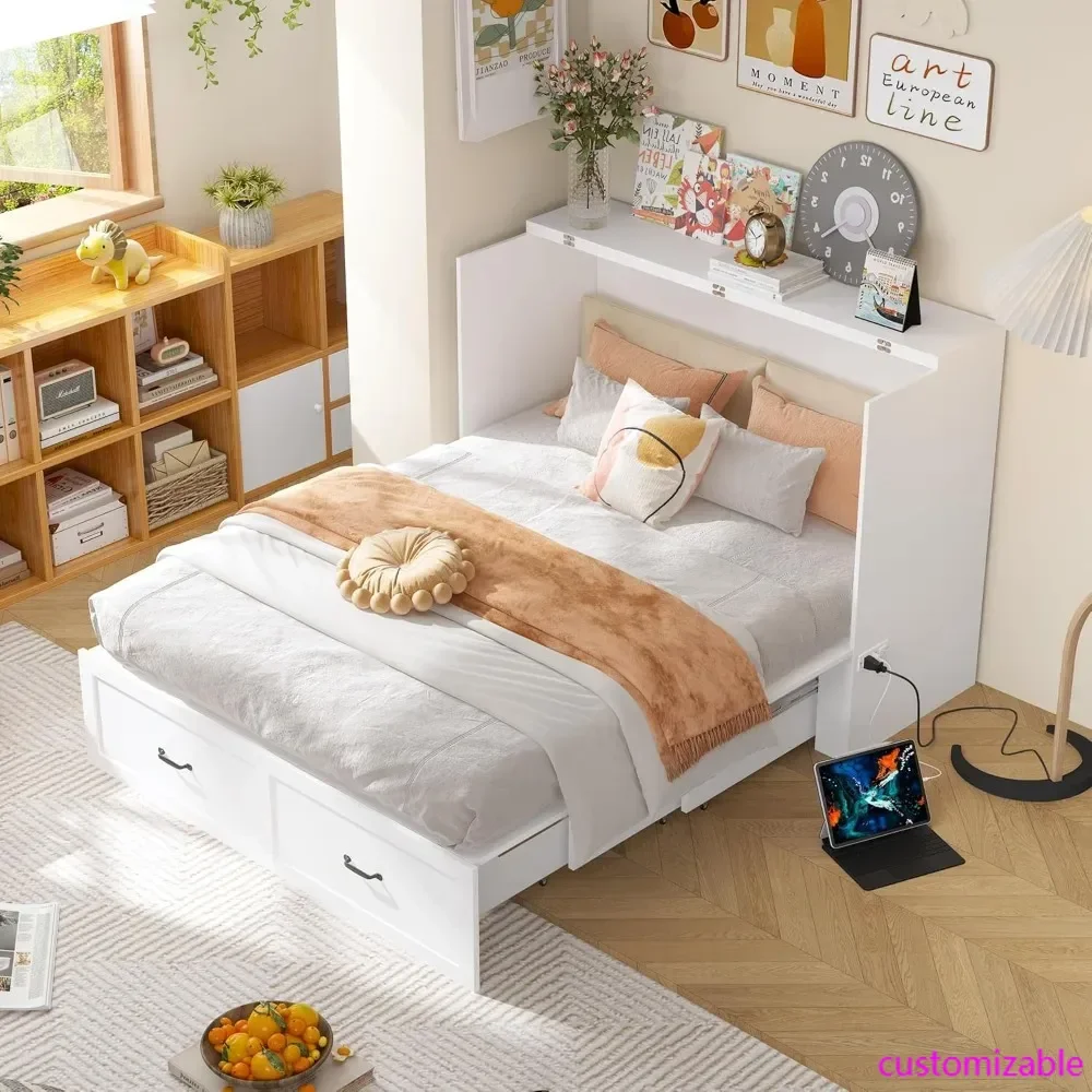 Full Size Murphy Bed Wood Wall Bed Cabinet with Large Drawer Space-Saving Hidden Foldable Platform Bed Chest Mobile Cabinet