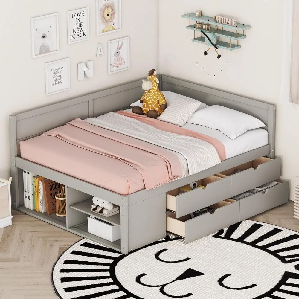 Full Size Wooden Daybed with 4 Drawers and Storage Shelves, Platform Bed Frame with L-Shaped Headboard and Slatted Support