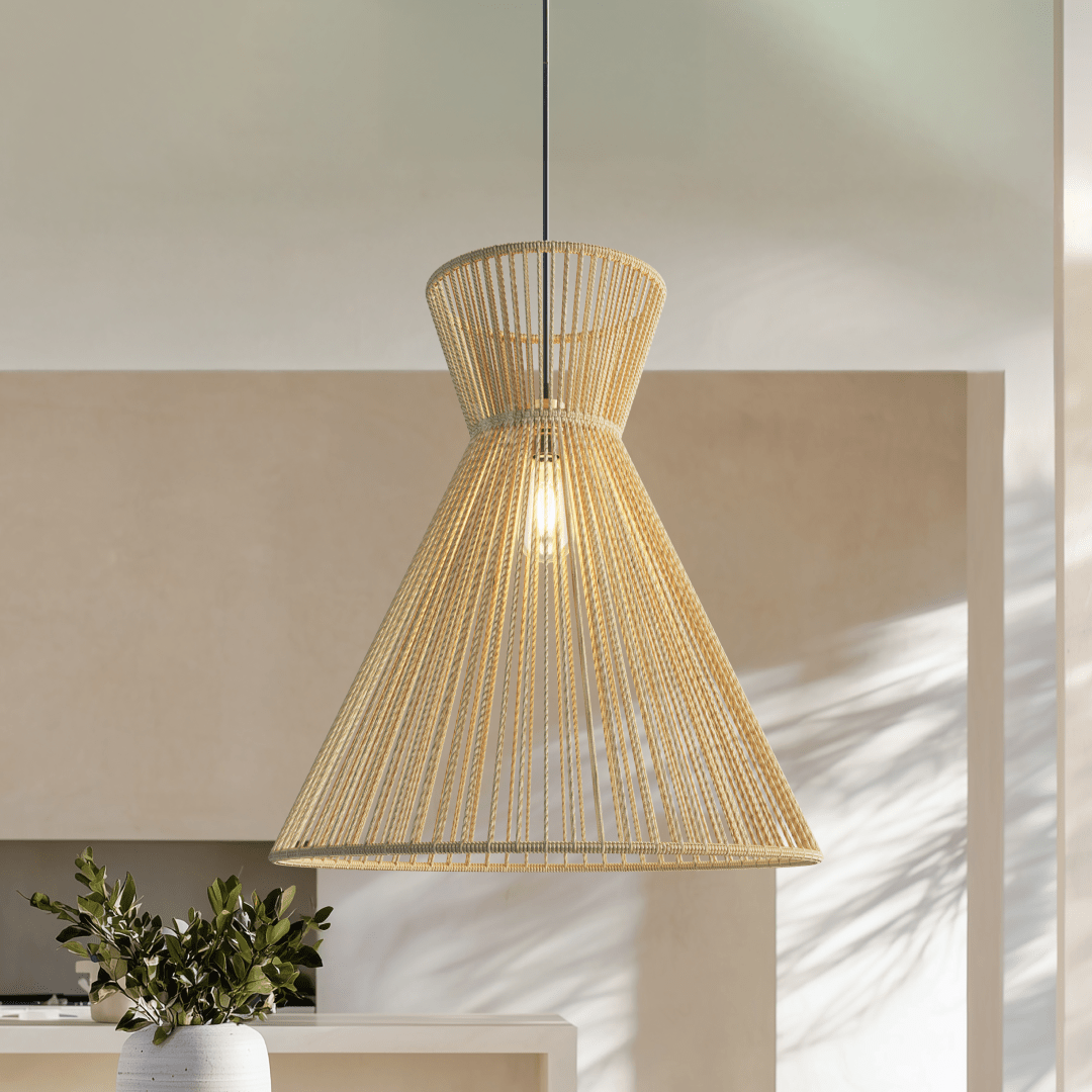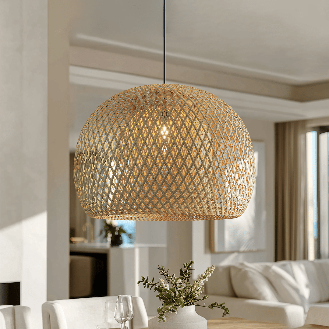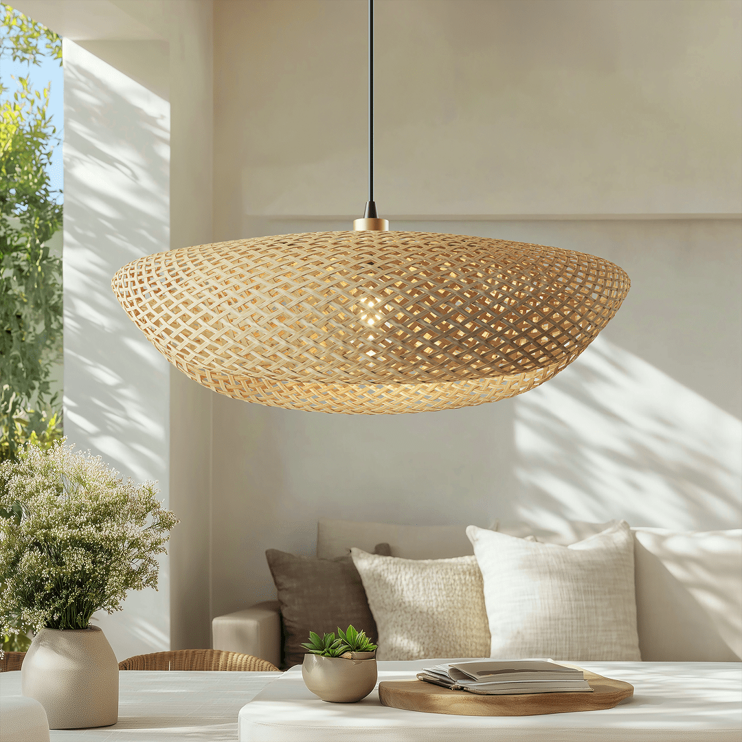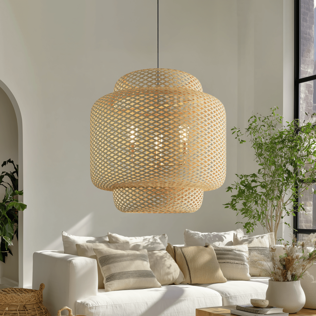 Crafted with hand-knitted bamboo, Liora brings soft texture and an airy, sculptural presence to any space. Its wide, organic form diffuses light with natural warmth—perfect for creating a relaxed, modern boho atmosphere.