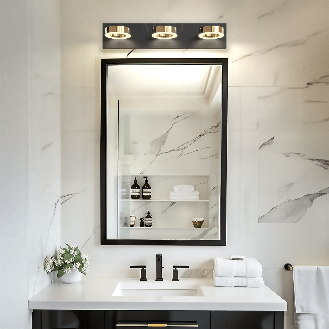 Introducing Aurora, a modern bathroom light that combines elegance and functionality. Featuring three sleek circular lights set on a matte black base with gold accents, Aurora delivers a warm, even glow ideal for bathroom vanities. Its minimalist...