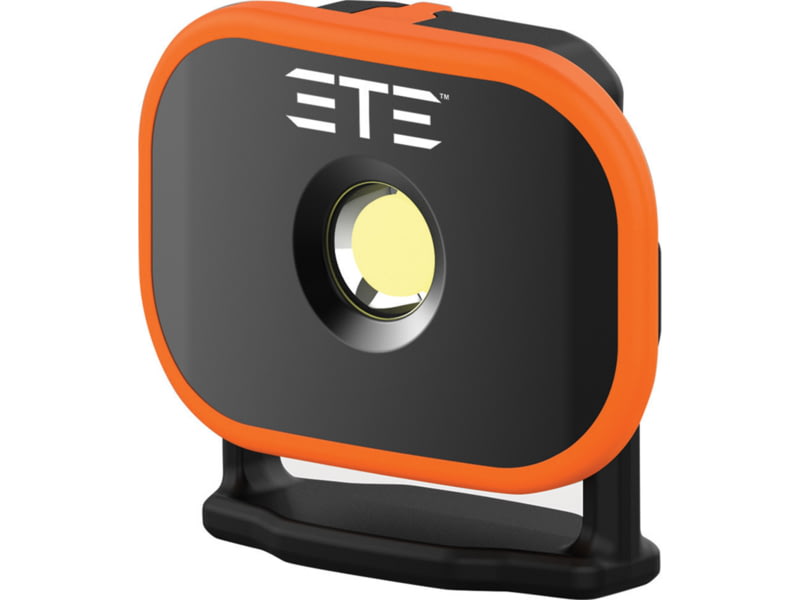 ETE Mini Sport Flood Light. 5" x 4.38" x 1.38". Water resistant. Rechargeable. Impact resistant. Modes: High (750 lumens 1h runtime); Low (350 lumens 4h runtime). 3-4 hour charge time with USB-C. Dimming capability. 180 degree swivel magnetic base....  Read more