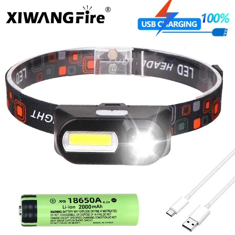 Powerful COB+LED Headlamp 18650 2000MaH Rechargeable Headlight Waterproof Head Lamp Bright Head Flashlight for Camping Cycling