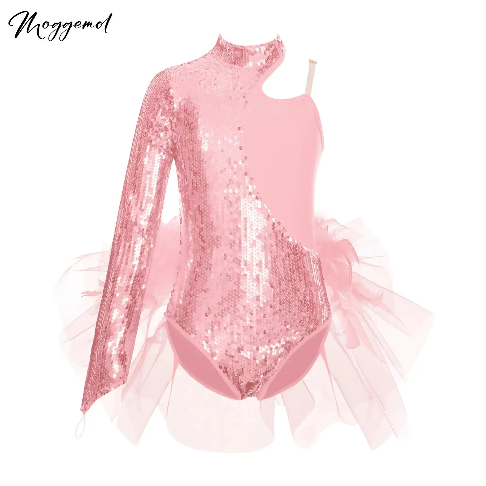 Kids Girls Ballet Dance Leotard Figure Skating Gymnastics Asymmetrical Shoulder Costume Sequins Feather Tutu Skirted Bodysuit