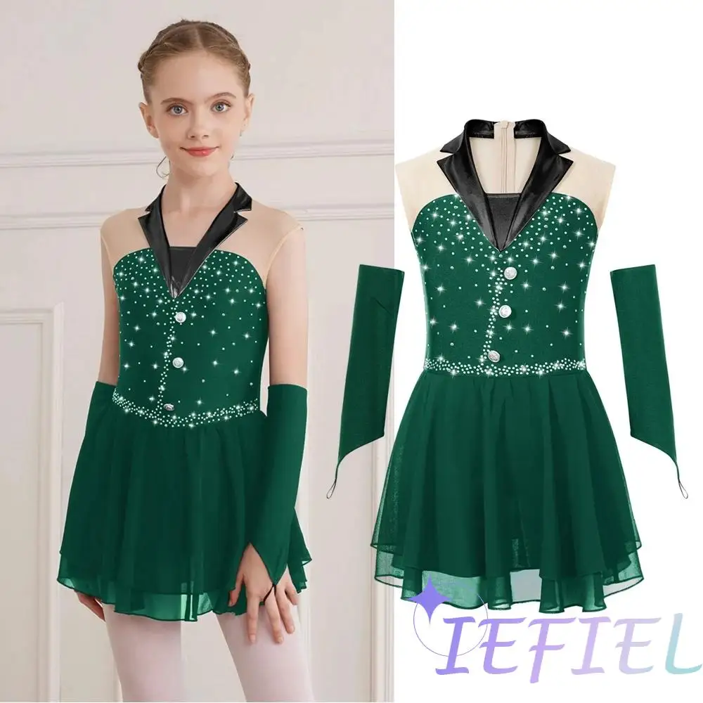Kids Girls Fancy Figure Skating Dance Dress Ballet Gymnastics Latin Cha-cha Performance Dancewear with Built-in Briefs + Gloves