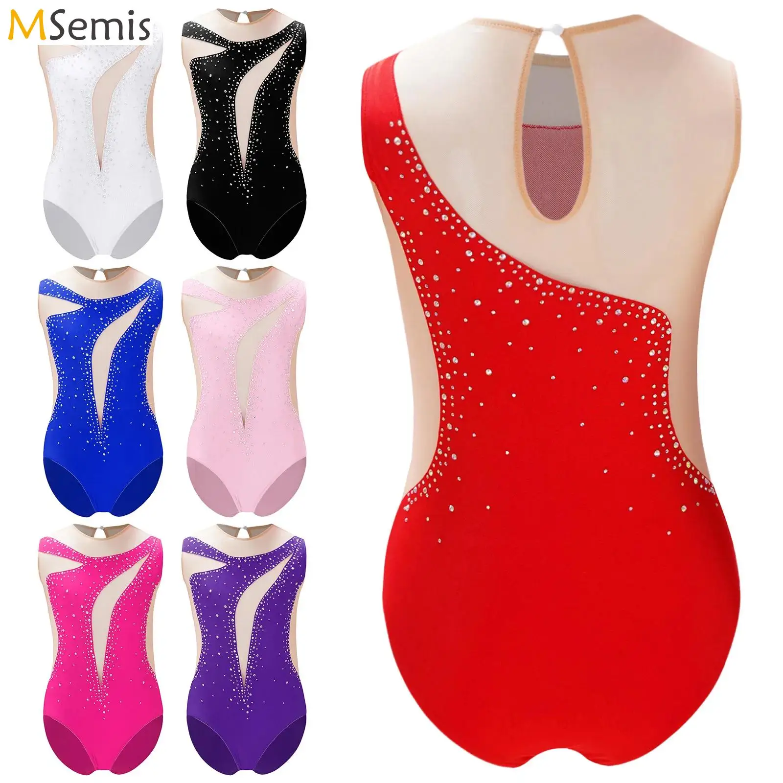Kid Girls Shiny Rhinestone Ballet Dance Leotard Diamond Sparkly Figure Skating Costume Sleeveless Sheer Mesh Bodysuit Dancewear