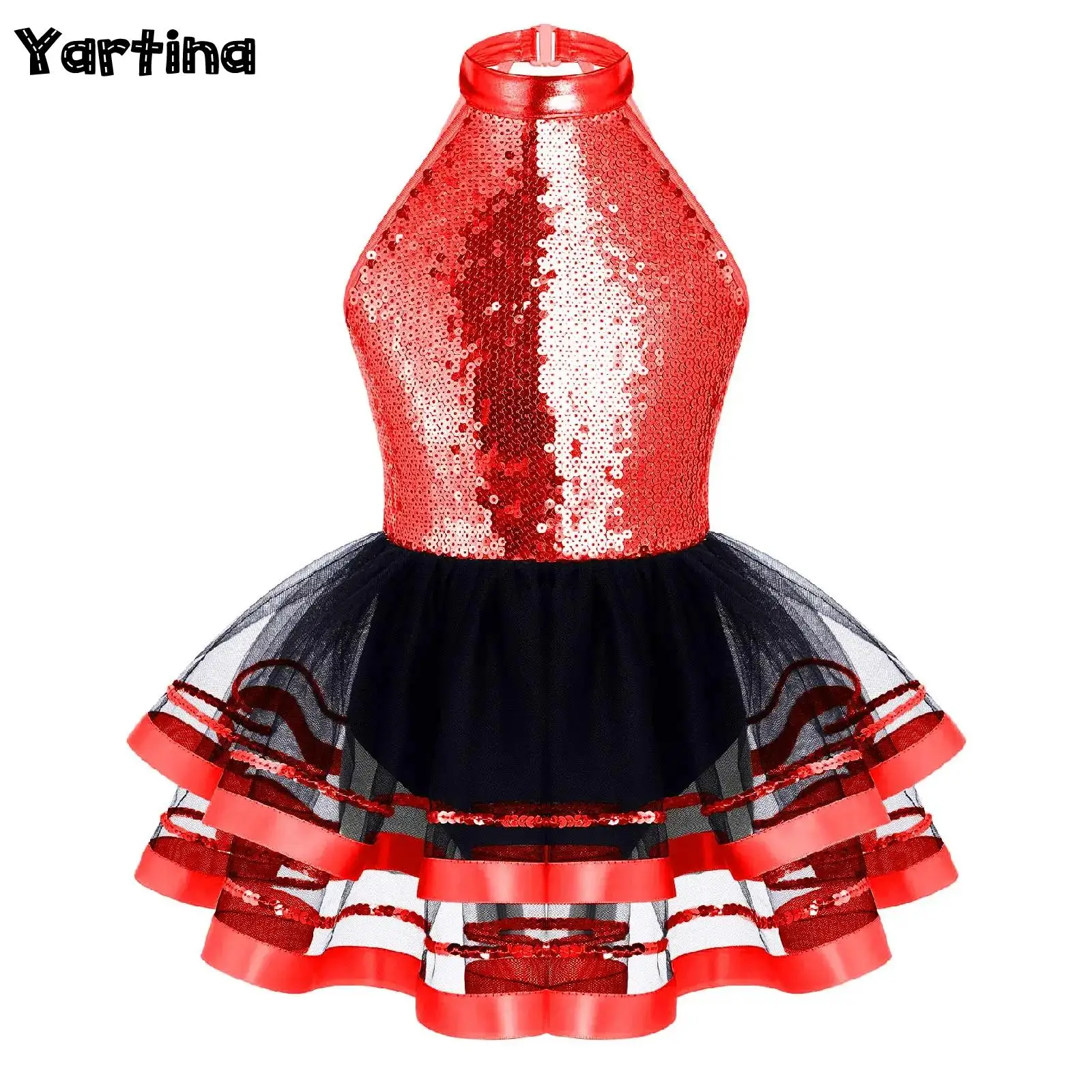 Kids Girls Sequins Ballet Jersey Costume Gymnastics Leotard Figure Skating Latin Jazz Dance Performance Mesh Tutu Skirted Dress