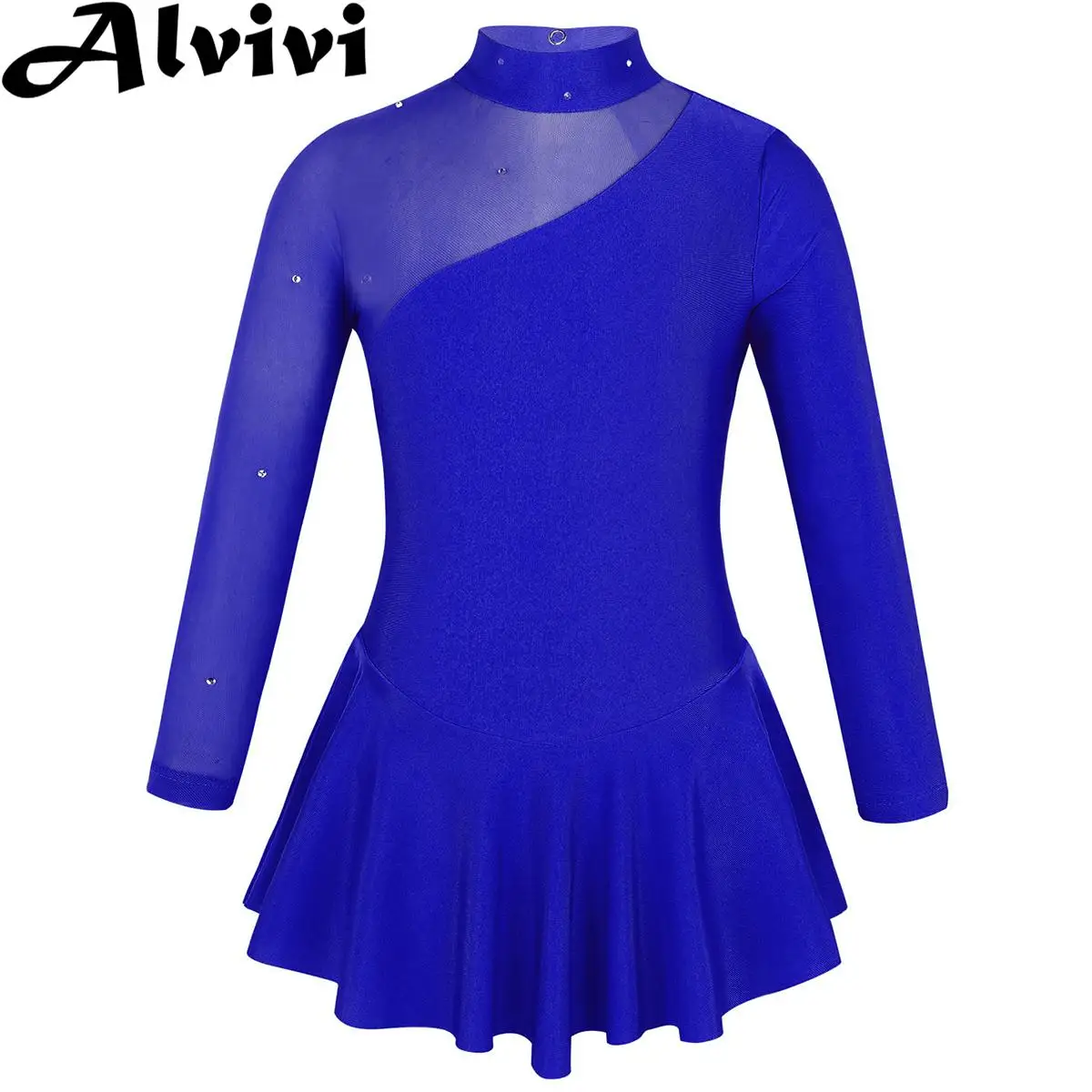 Kids Girls Long Sleeve Figure Ice Skating Dress Sheer Mesh Rhinestones Ballet Dance Leotard Tulle Hollow Roller Skating Dresses