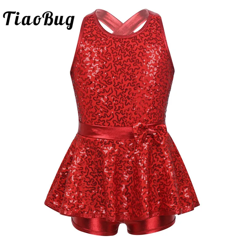 Kids Sleeveless Sequined Dancewear Gymnastics Leotard Girls Ballet Figure Skating Dress Modern Rave Jazz Dance Costume