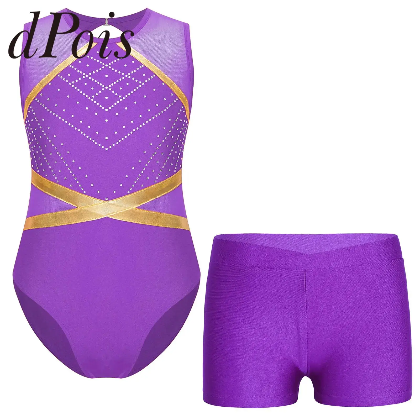 Kids Girls Gymnastics Leotard Keyhole Back Patchwork Sleeveless Figure Skating Bodysuit with Shorts for Ballet Dance Jumpsuit
