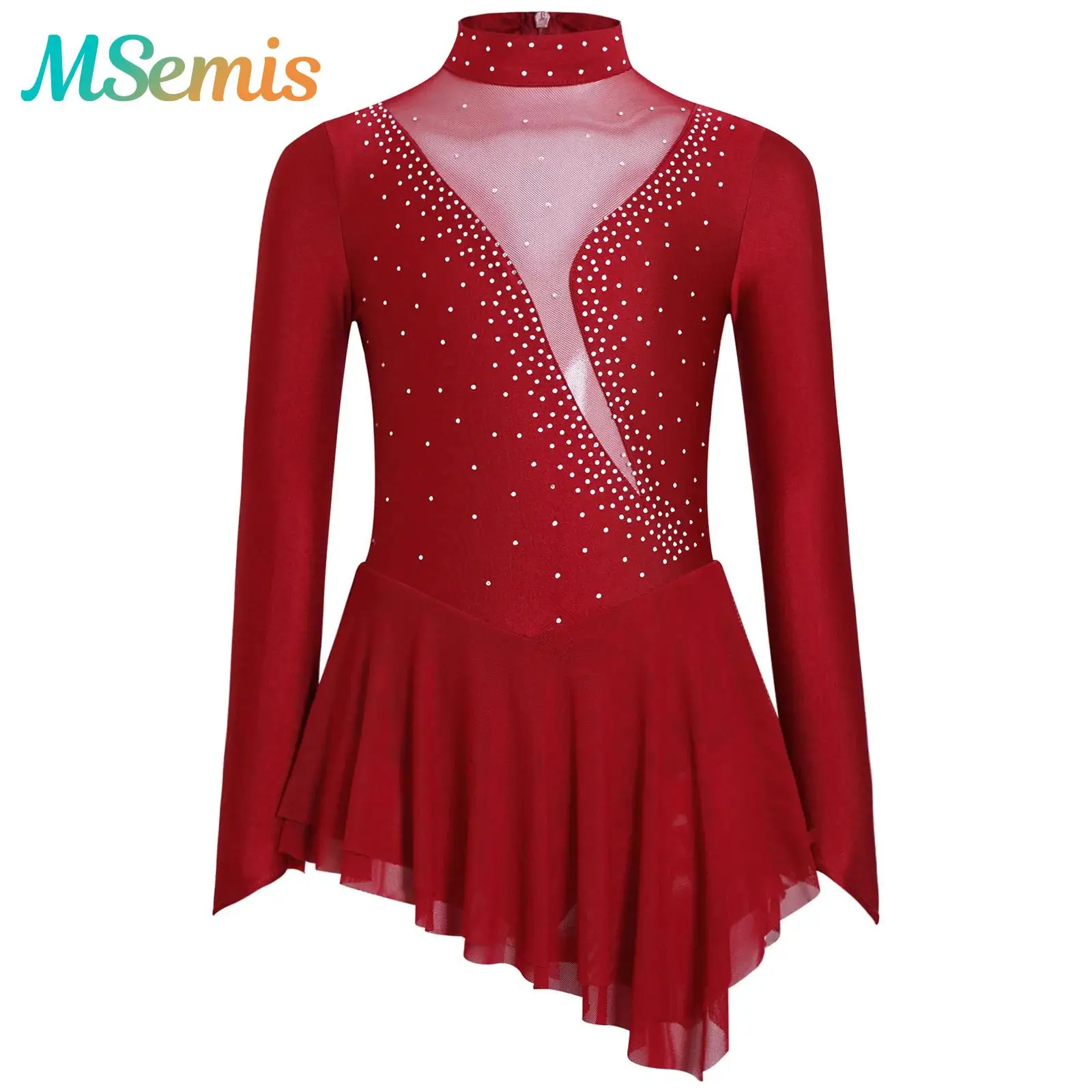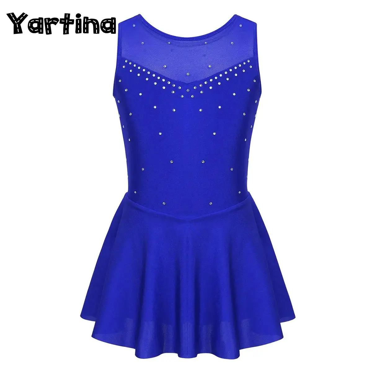 Kids Girls Gymnastics Figure Skating Dress Sheer Mesh Glittery Rhinestones Ballet Tutu Dress Lyrical Dance Performance Costume