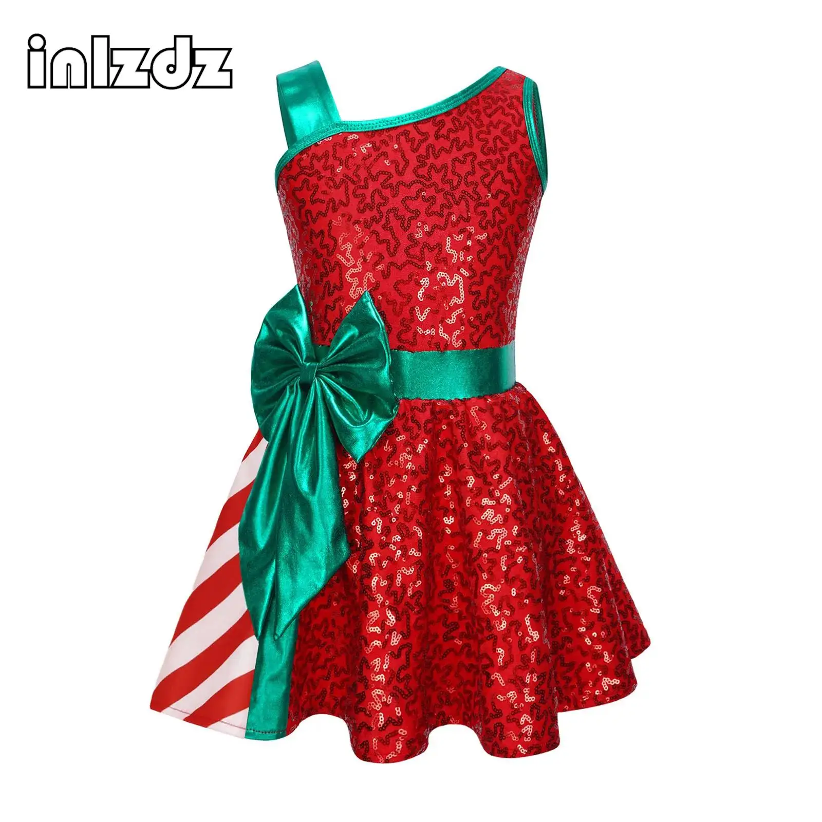Girls Candy Cane Xmas Christmas Elf Santa Claus Cosplay Costume Sequin Figure Skating Dress Ballet Tutu Dance Leotards Outfits