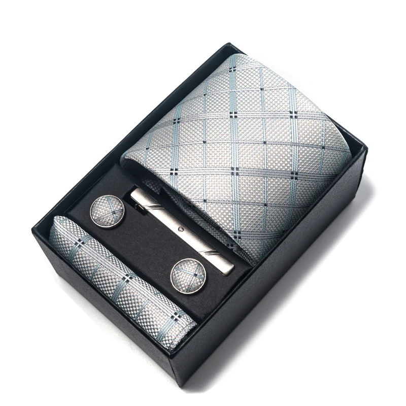 Hot Sale Luxury Grey Plaid Tie Handkerchief Cufflink Set For Men Necktie Box Suit Accessories Birthday Present Fit Formal Party