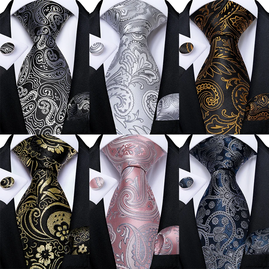 Grey And Gold Color Paisley 8cm Necktie Handkerchief Cufflinks Black Pink Grey Floral Wedding Party Silk Ties for Men Gift  Read more