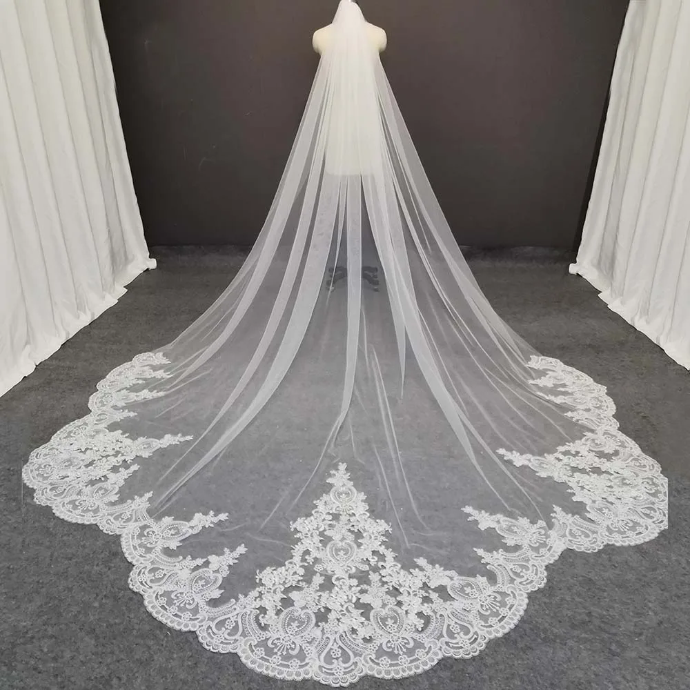 Real Photos Scallop Lace Long Wedding Veil 3.5 Meters Royal Bridal Veil with Comb White Ivory Veil for Bride Wedding Headpiece
