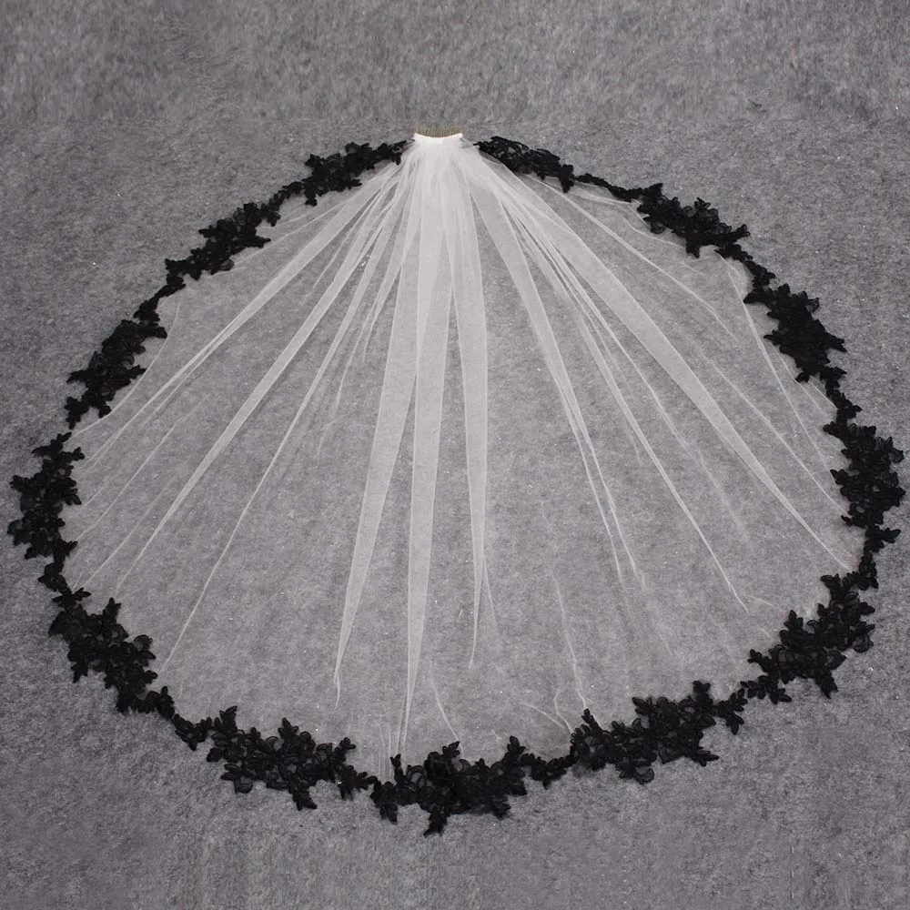Customized Black Lace Appliques White Ivory Tulle Short Wedding Veils One Layer Bridal Veil with Comb Veu de Noiva