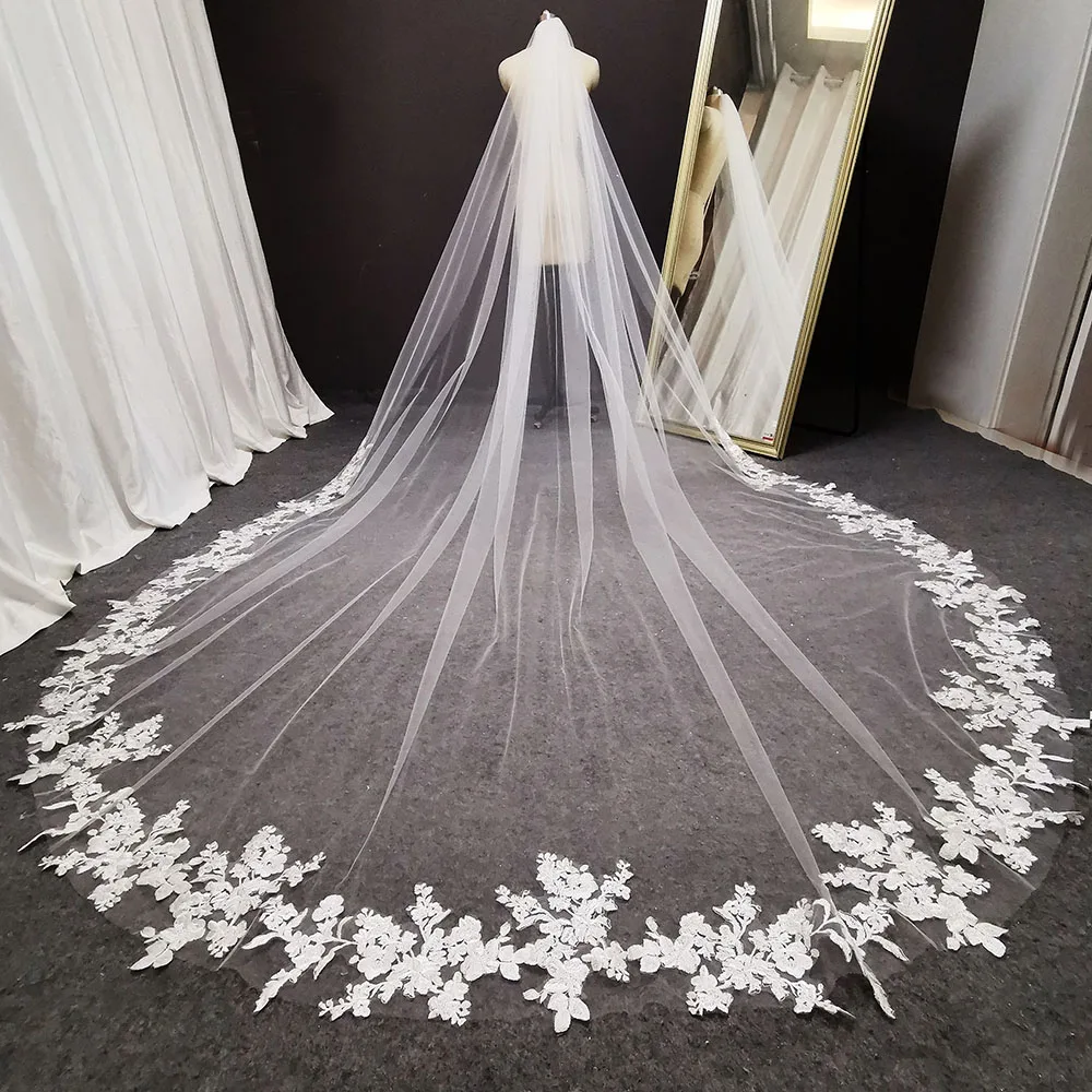 5m 4m 3m Long Wedding Bridal Veils Lace Appiques Edge 1 T Tulle Cathedral Veil with Comb Ivory White Velo De Novia Voile Mariee
