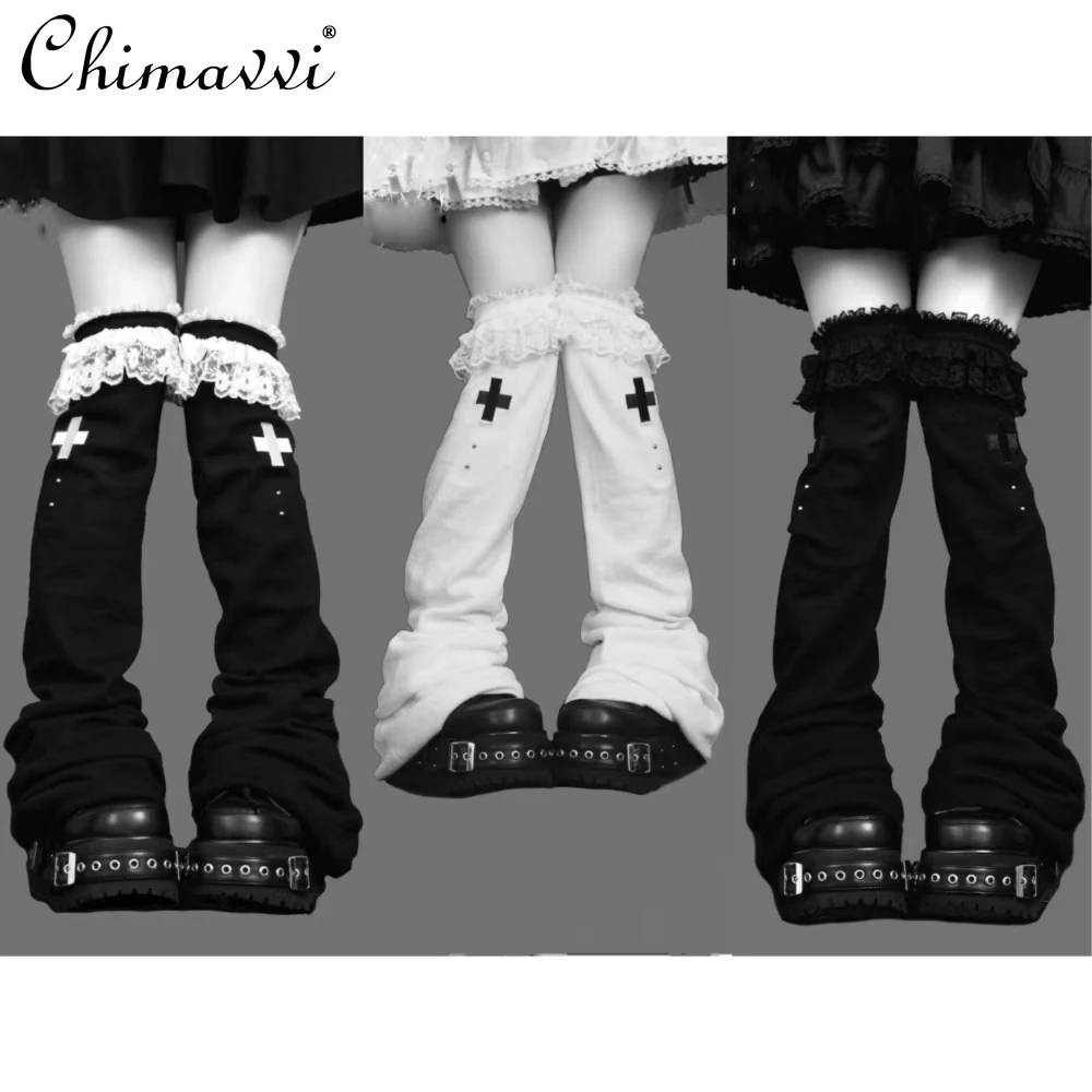 Dark Girls Patchwork Lolita Lace Wide Leg Socks Japanese Mine Series Cross Subculture Leg Warmer Gothic Y2K Thigh High Socks