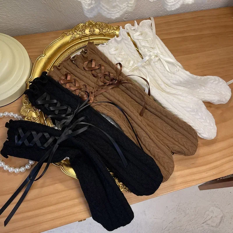 Warm Wool Girl Sock Chic Sweet Korean Lace Tie Bow Ruffle Calf Sock for Kids Autumn Soft Wool Pile Sock Clothes Accessories