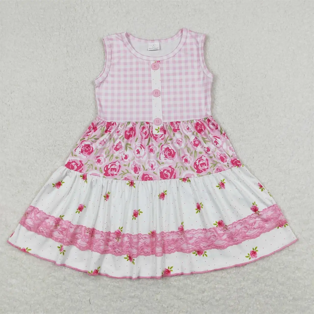 Wholesale Baby Girl Summer Sleeveless Flower Lace Dress Toddler Knee Length One Piece Kids Children Floral Pink Plaid Clothing
