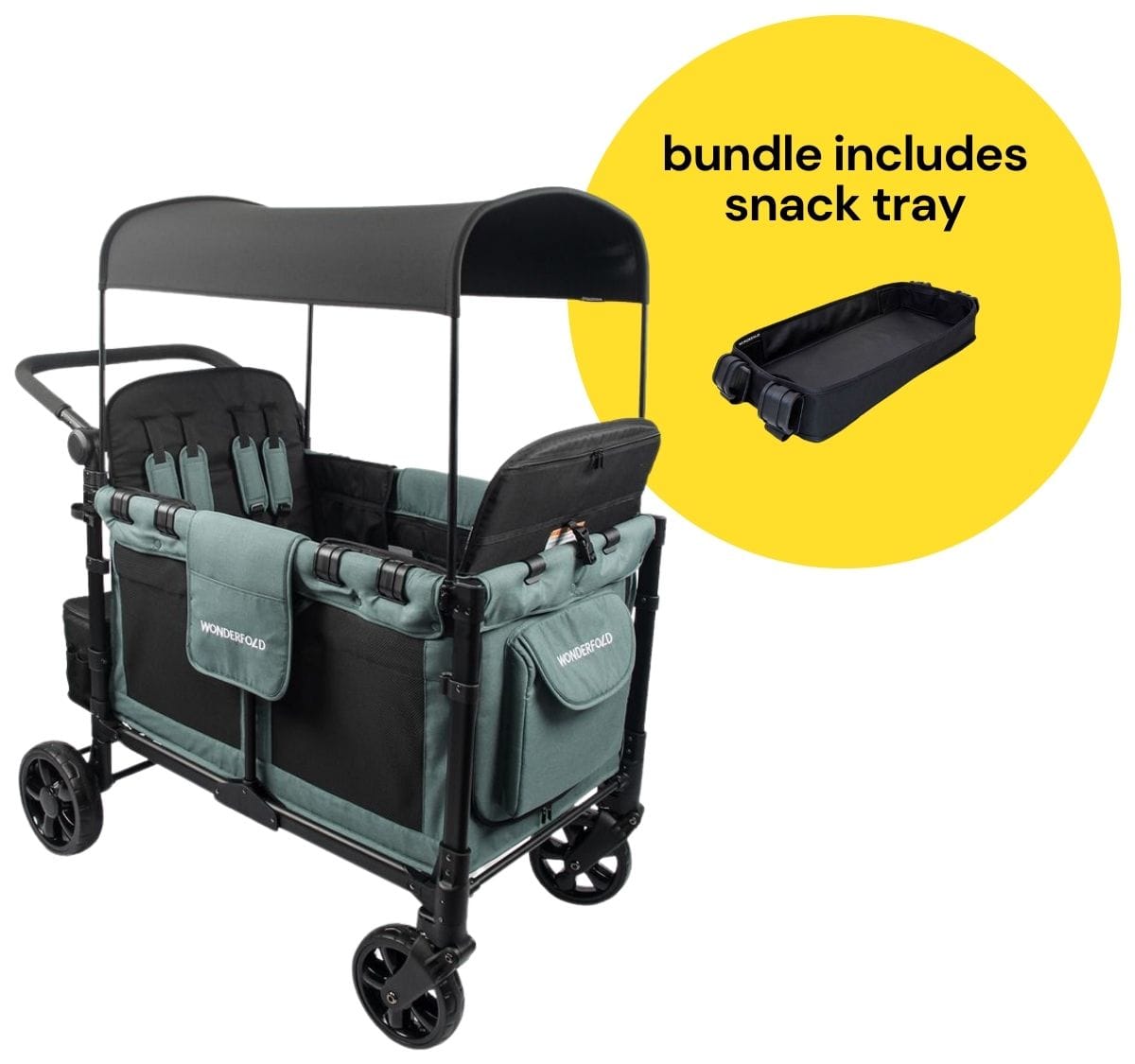 WonderFold W4 Elite Multifunctional Quad (4 Seater) Stroller Wagon + Snack Tray Bundle - Hunter Gree