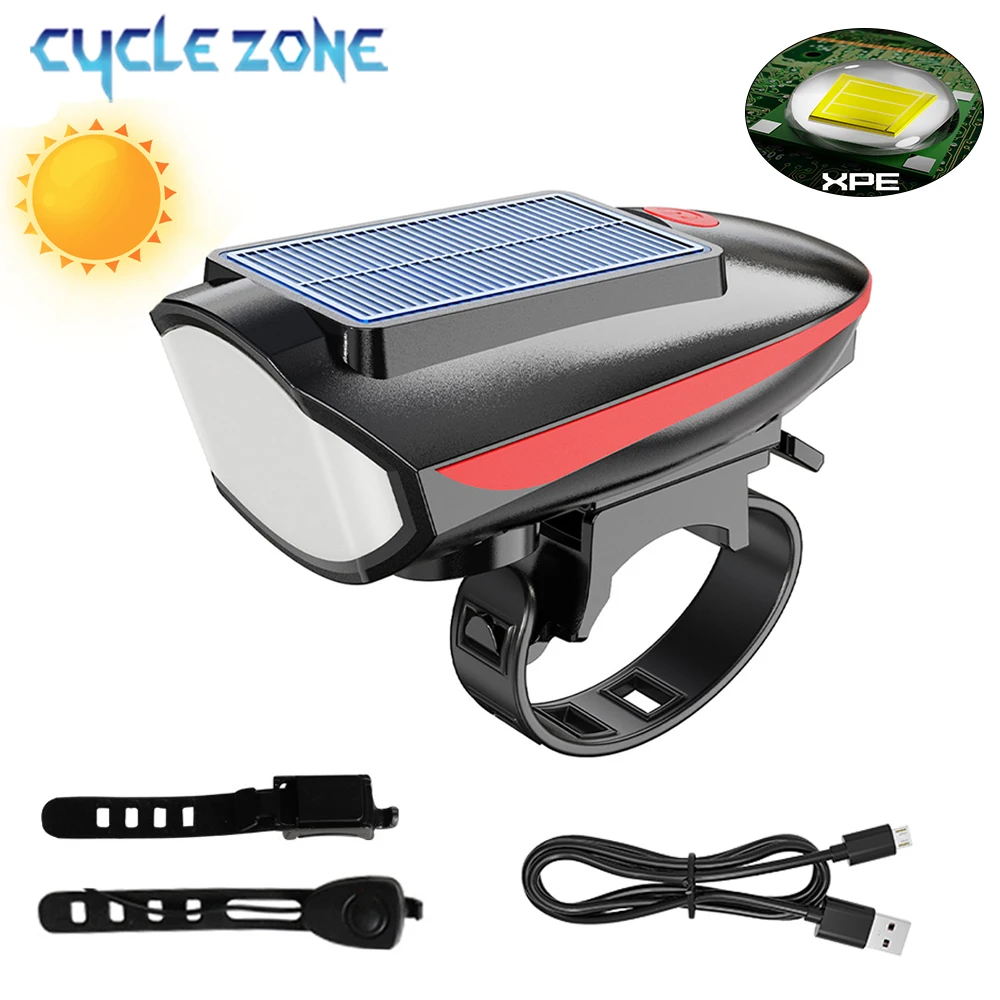 Solar Bicycle Headlight USB Rechargeable MTB Bike Solar Front Light with Horn for Night Riding Waterproof Bicycle Accessories