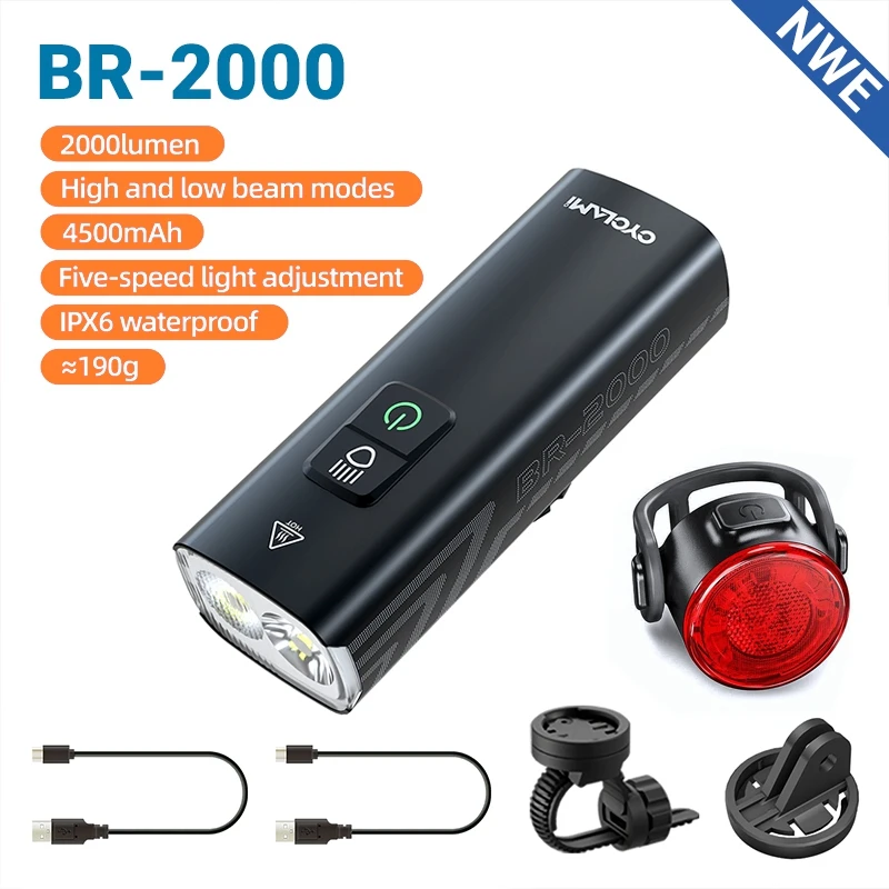 CYCLAMI Bicycle Light BR 2000 1200 Lumens LED Rechargeable Set Road MTB Bike Front Back Headlight Lamp Flashlight Cycling Light