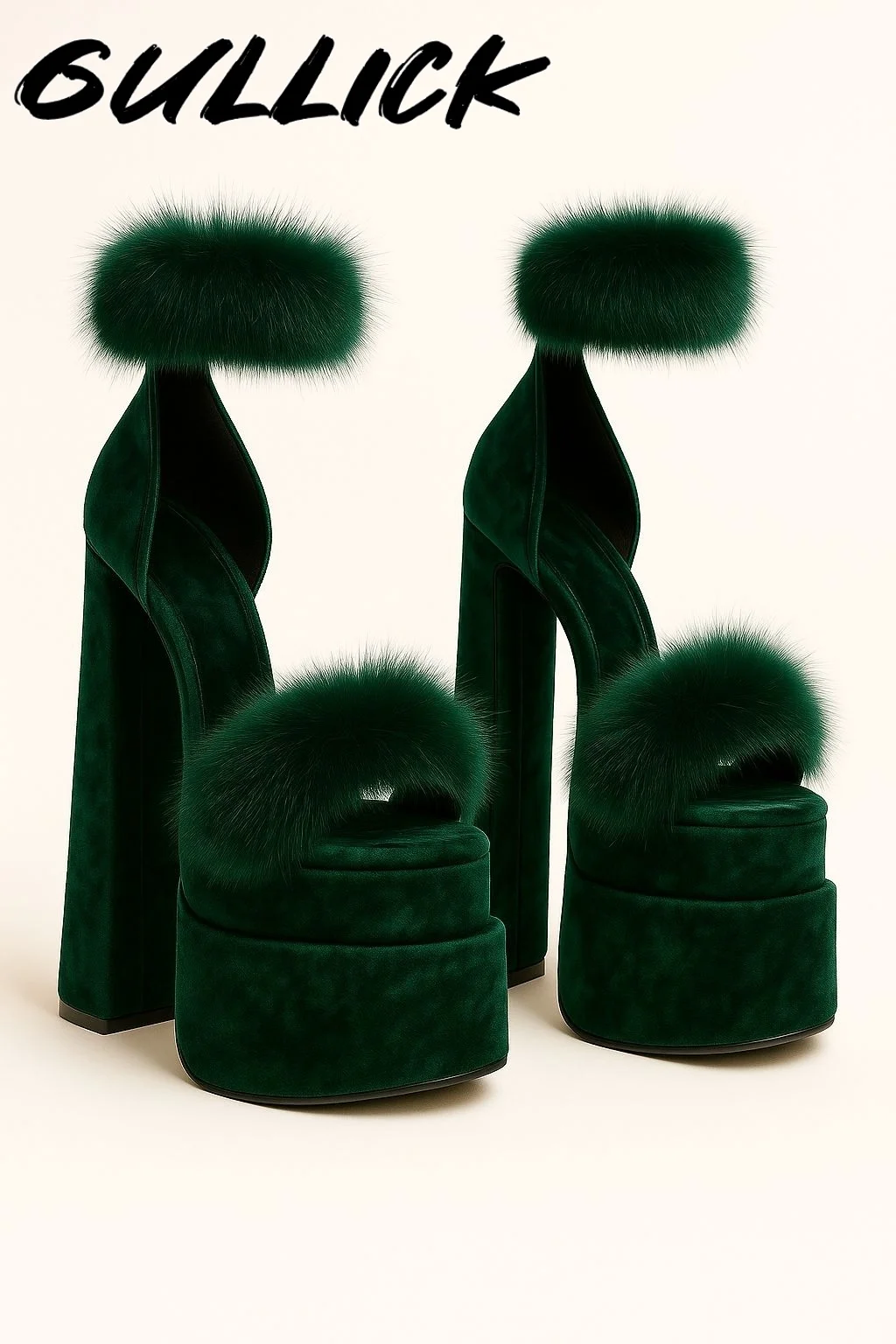 Green Platfrom Fur Heeled Sandals One Strap High Heels Chunky Heel Women Luxury Designer Shoes Summer Sandalias De Mujer 2025