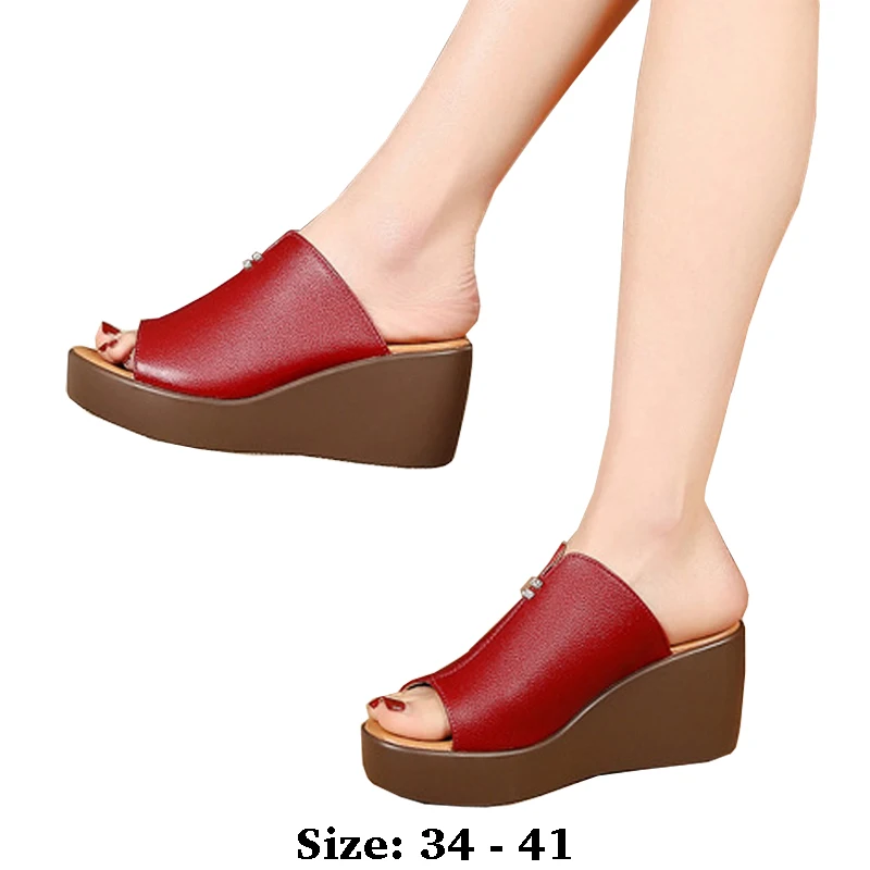 High quality leather wedge sandals for women 6.5 cm high heel 2025 summer 34 35 platform open toe elegant fashion shoe red green