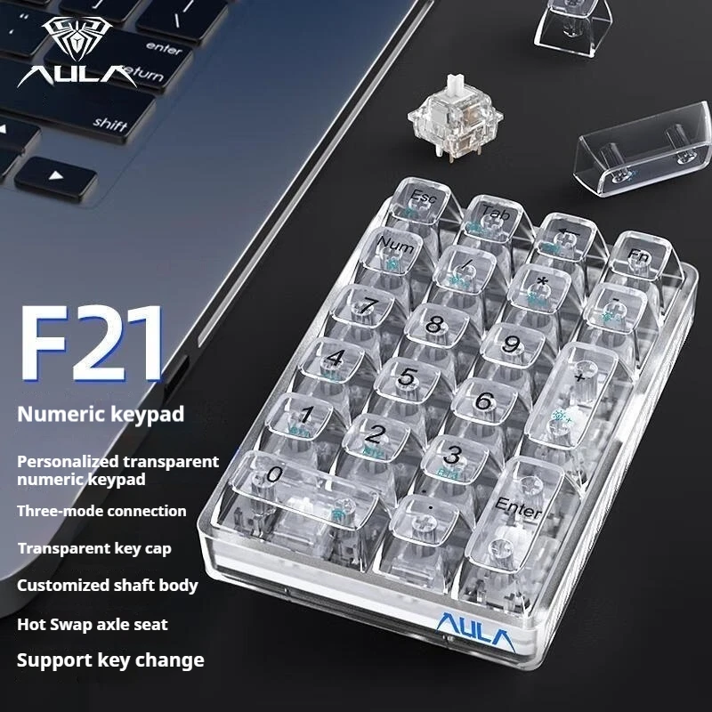 AULA F21 Wireless Numeric mini Keyboard 21Keys Mechanical Keyboard Bluetooth 2.4G Wired RGB Transparent Gaming Number KeyPad