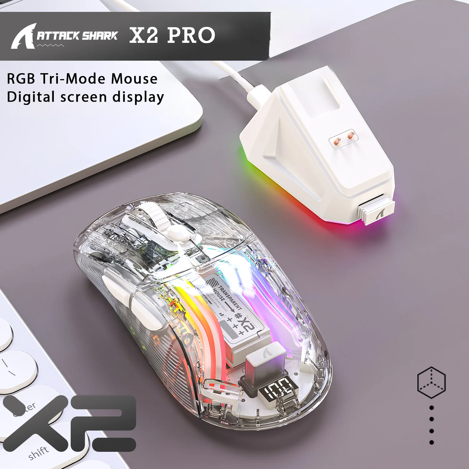 Attack Shark X2 Pro Wireless Gaming Mouse RGB, Tri-Mode Bluetooth, Silent Click, Battery Display, Magnetic Charging Dock