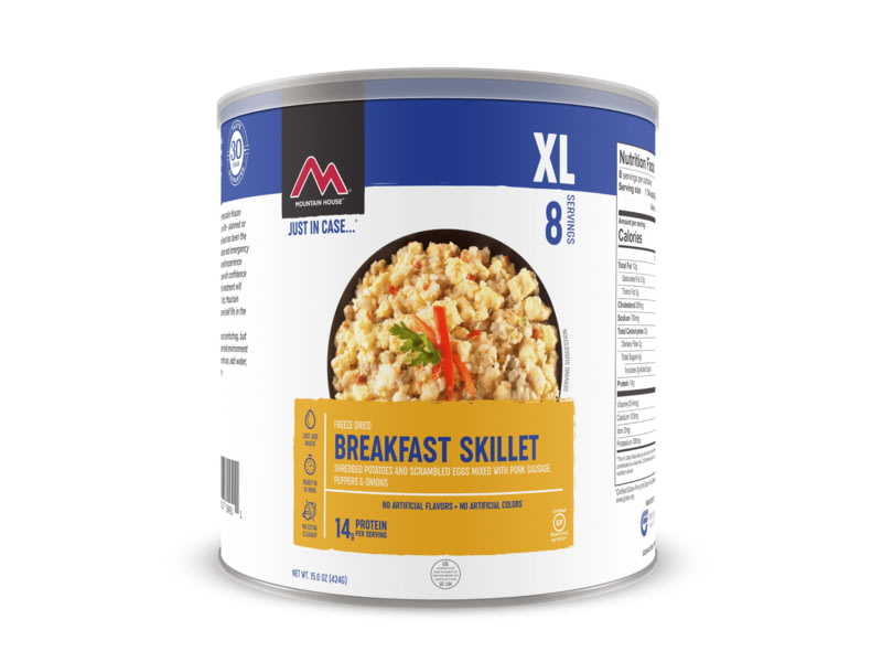Mountain House Breakfast Skillet 8 Servings 30451. This breakfast will wake you up and fuel you before you go-go. Hash browns and scrambled eggs mixed with pork sausage patty peppers and onions. Keeping it classic. Specifications for Mountain House...
