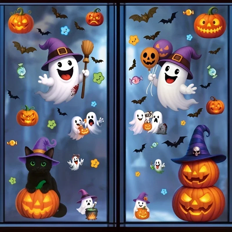 Halloween pumpkin glass stickers, exquisite holiday party decoration arrangement candy pumpkin lantern black cat window stickers  Read more