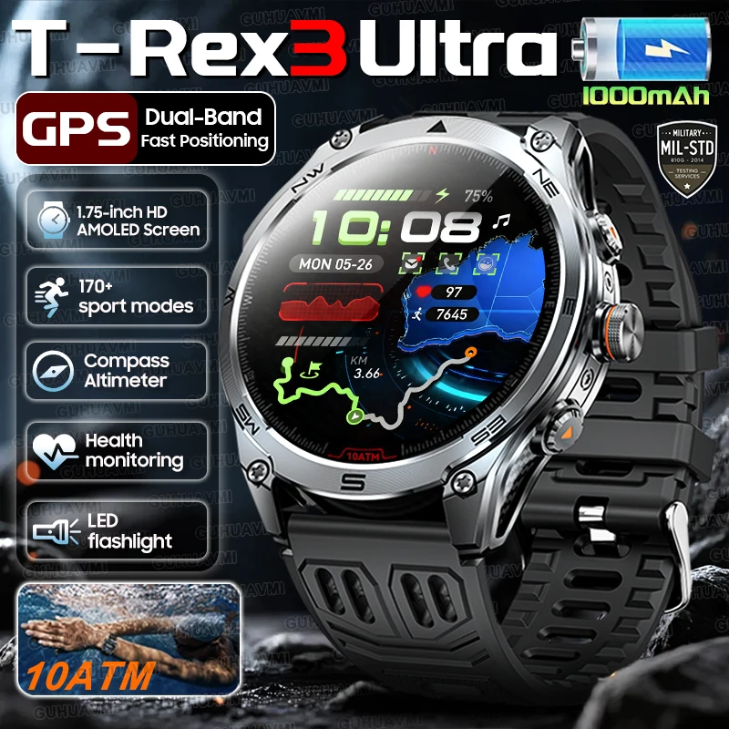2025 New Military T-Rex 3 Ultra GPS Smart Watch 1000mAh Battery 10ATM Waterproof Compass Flashlight Sports trackr Smartwatch Men