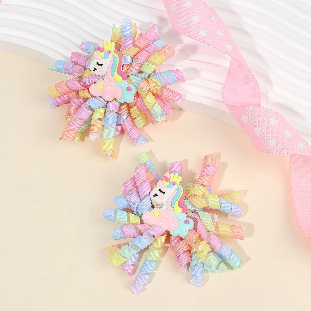 2Pcs Cartoon Unicorn Hair Clips Firework Rainbow Curled Ribbon Tassels Hairpins For Girls Children New Headwear Hair Accessories  Read more