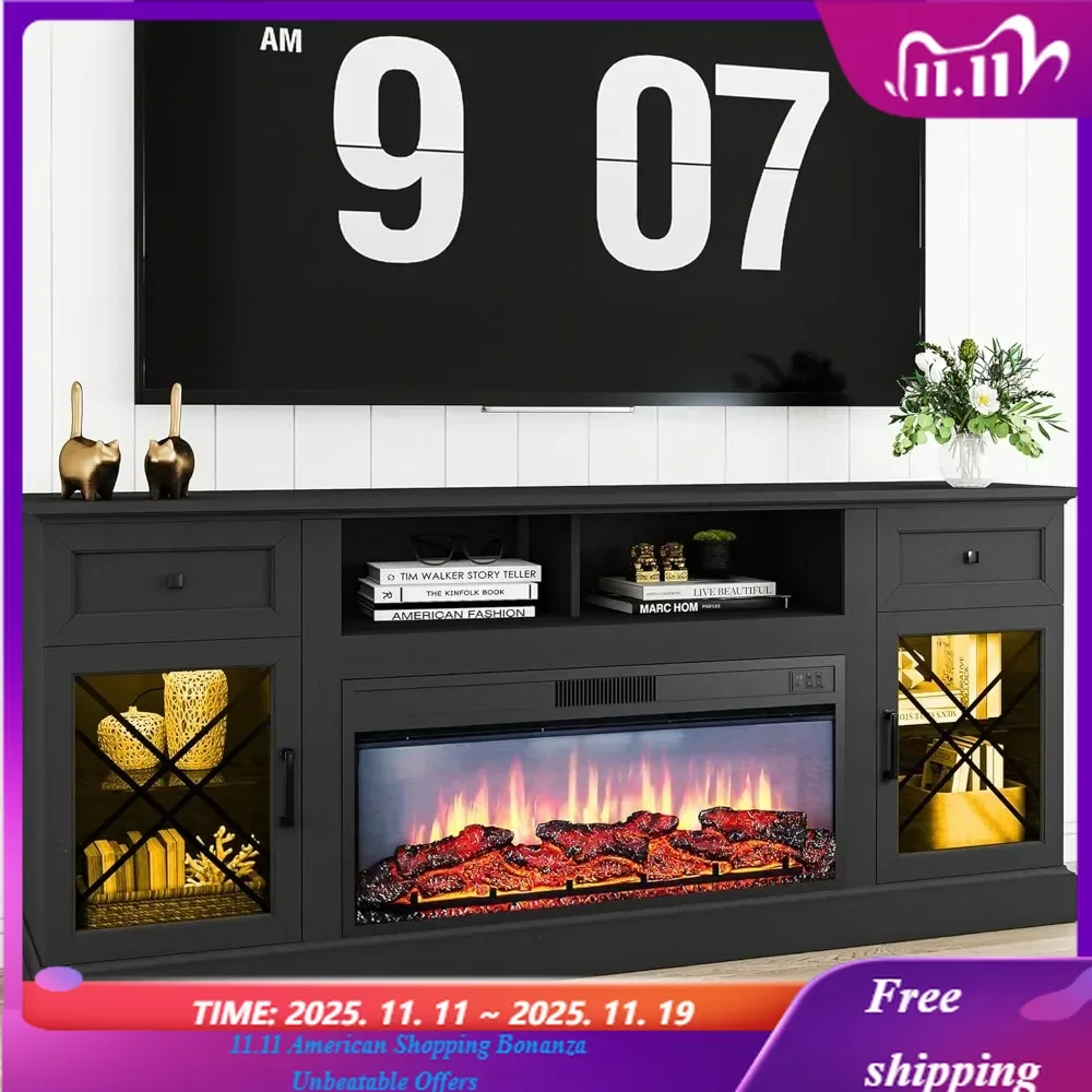 Modern 70" TV Stand with Electric Fireplace for TVs up to 80" LED Lights Glass Door Entertainment Center