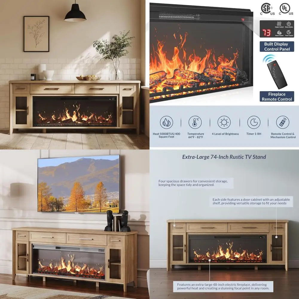 74 Inch Rustic TV Stand with 48 Electric Fireplace, Extra Large Entertainment Center featuring Storage Cabinets and 4 Drawers