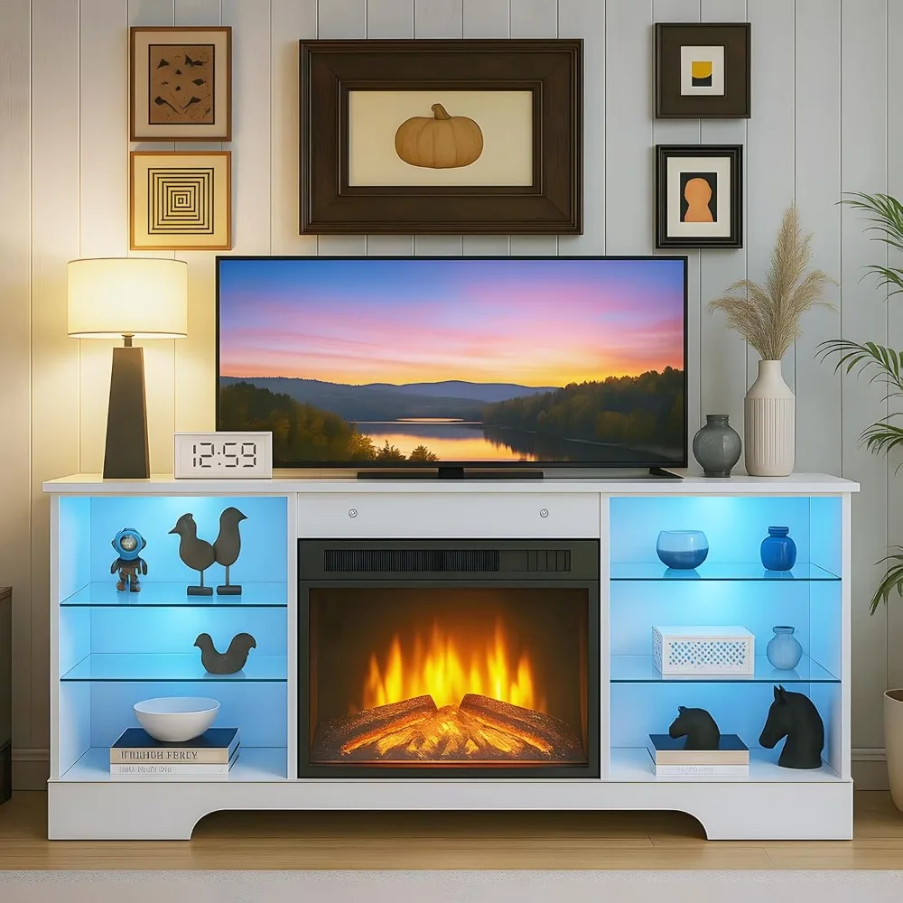 Fireplace TV Stand with LED Lights, Modern TV Console Table with Electric Fireplace for TV up to 65, Entertainment Center with O