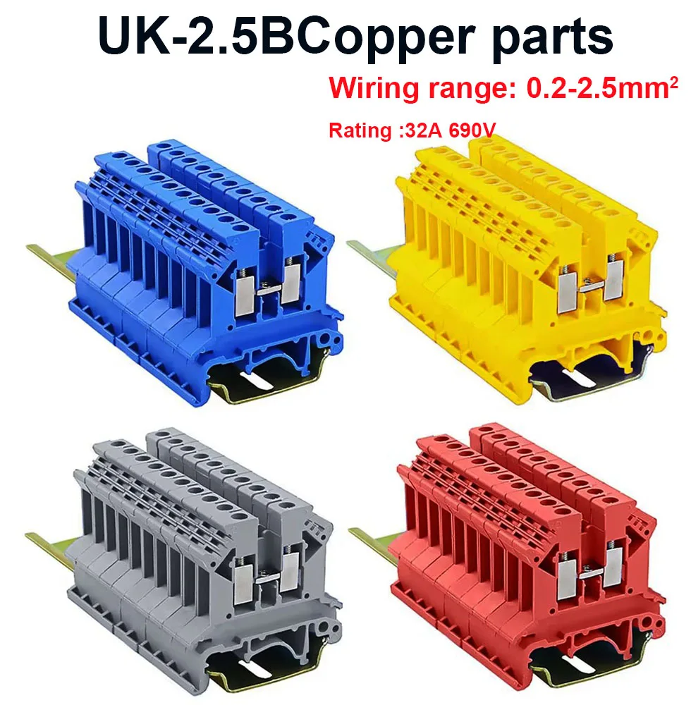 10pcs/lots UK-2.5B blue/grey/red/yellow 2.5mm2 DIN Rail Universal Combination Terminal Blocks Screw Type UK2.5B